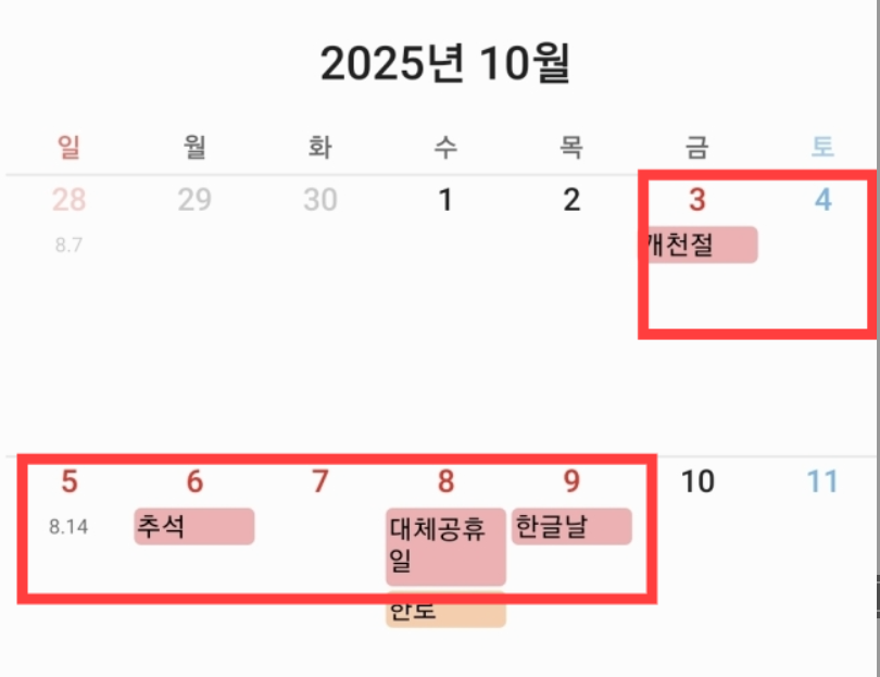 ➡ 연차 2일(10/8, 10/10) 사용 시 → 최대 10일 연속 휴가 가능! 🎉